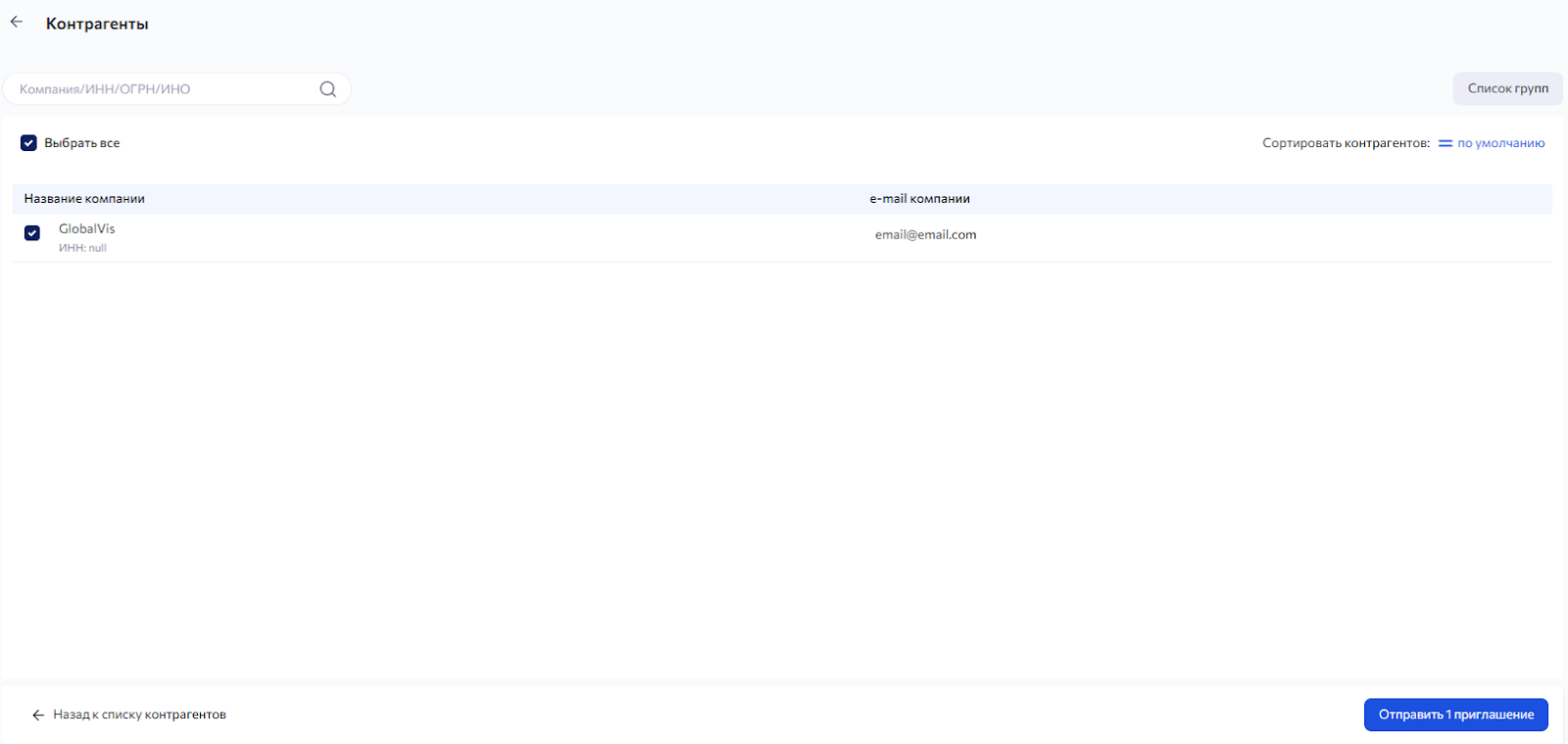 Если у вас есть импортированные контрагенты, которые ещё не зарегистрированы в системе, то у вас возможность пригласить таких контрагентов в систему массово или по одному.