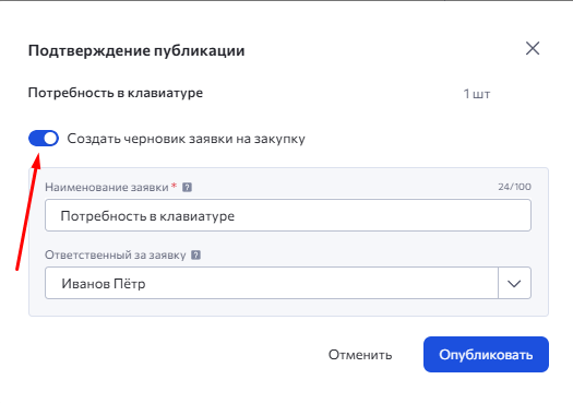 На основании потребности/потребностей возможно создание заявки на закупку или запроса. Возможно массовое или единичное создание потребности, а также формирование заявки или переход к формированию запроса при публикации потребности/ей и создание дополнительных полей.