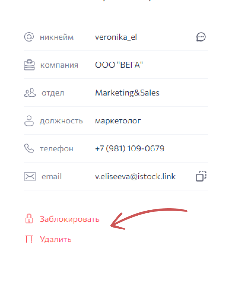 Удалить контакт — нажмите на иконку и из выпадающего списка выберете Удалить, после подтверждения пользователь будет удален из списка ваших контактов.