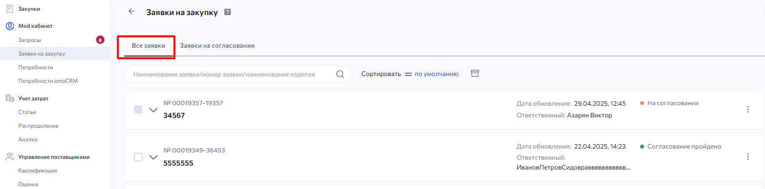 Все заявки на закупку- отображаются все заявки.