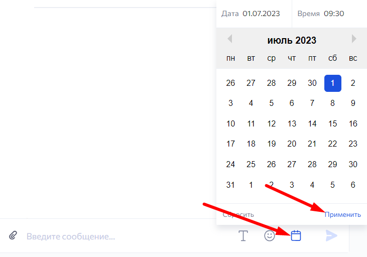 - Чтобы запланировать отправку сообщения, введите текст и нажмите на кнопку ,