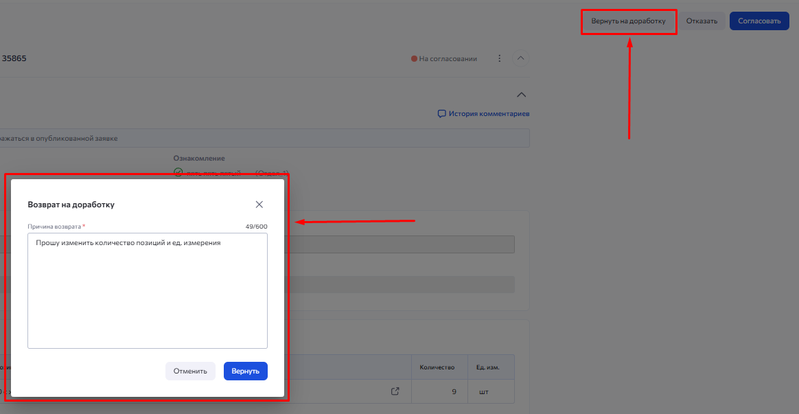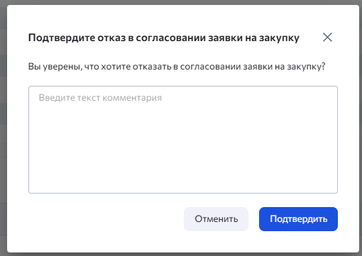 Если у вас роль согласующего, то вы можете вернуть заявку на закупку на доработку с комментарием. В комментарии можно указать причину возврата на доработку.