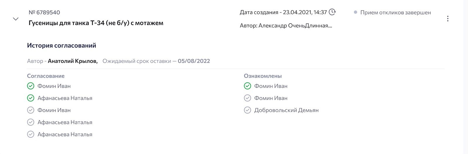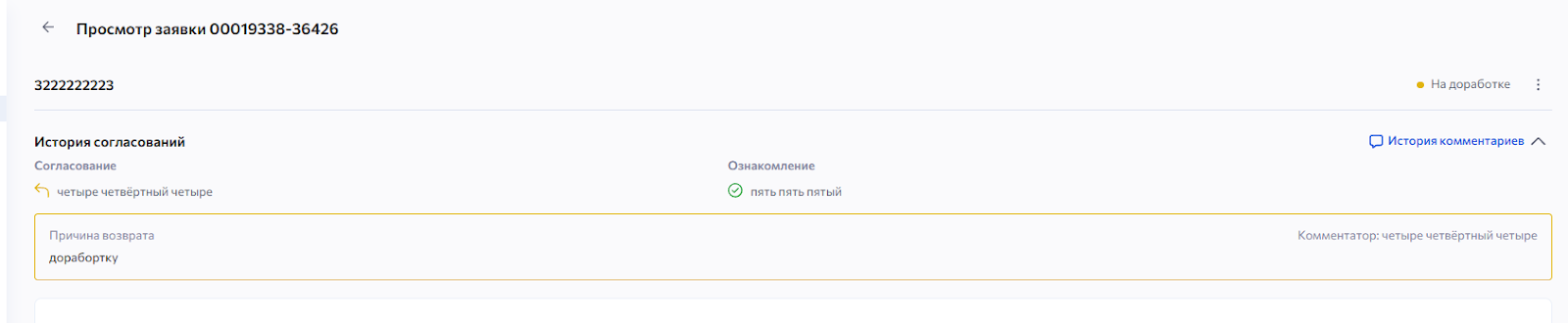 После согласования ознакомления с заявкой вам будет доступна история согласования заявки.